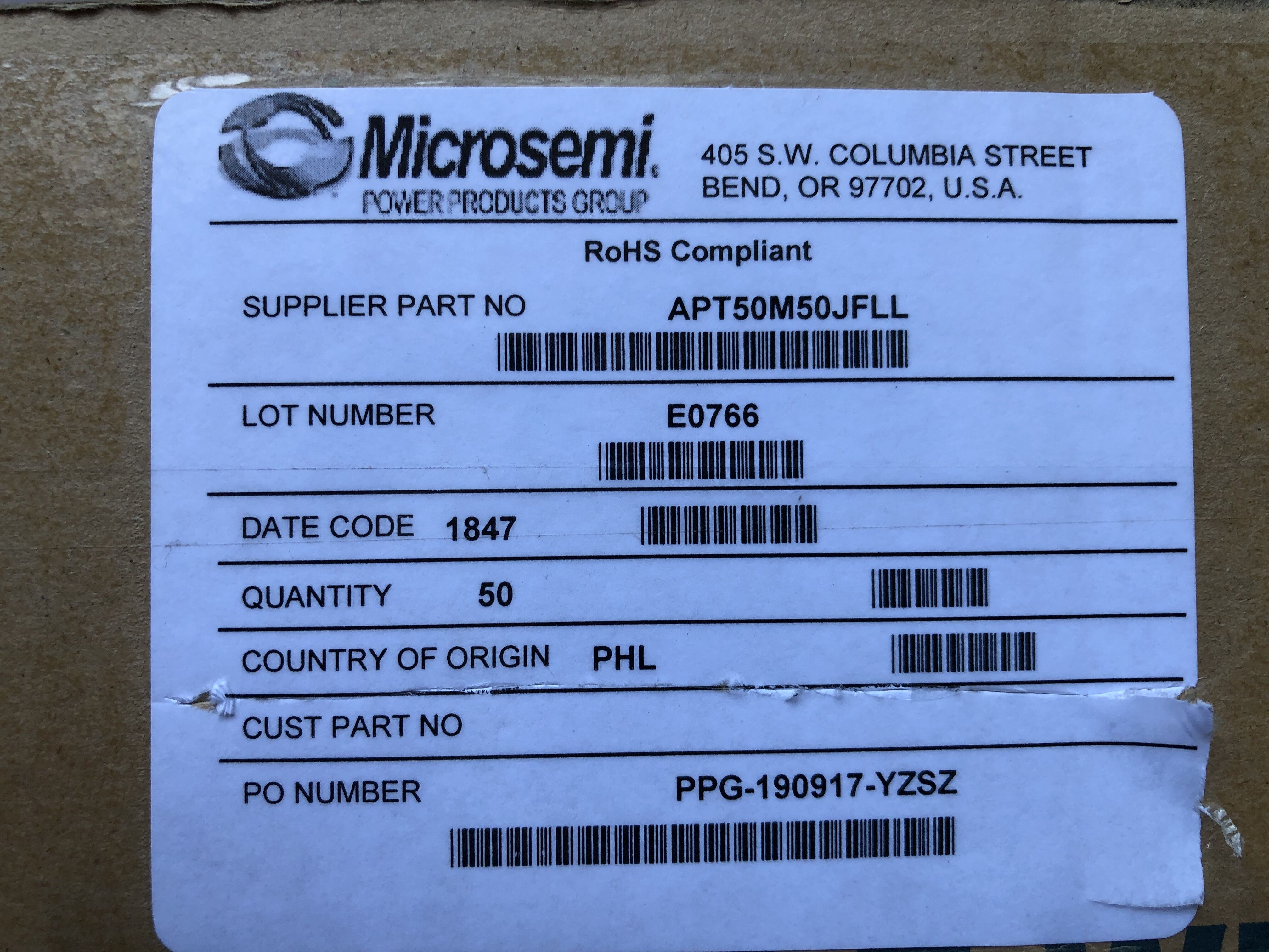 公司最新到貨Microsemi美高森美產品:APT50M50JFLL